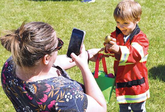 A very happy Leo Ramirez, 3, who was all decked out in a Fire Chief's coat, shows his mother, Kaeli, the golden egg he found Sunday afternoon at Bunn's Easter Egg Hunt. Other egg hunt photos from Youngsville, Bunn and Franklinton appear on Page 12 in this edition. By the way, Leo won a special prize for being one child who found a golden egg.